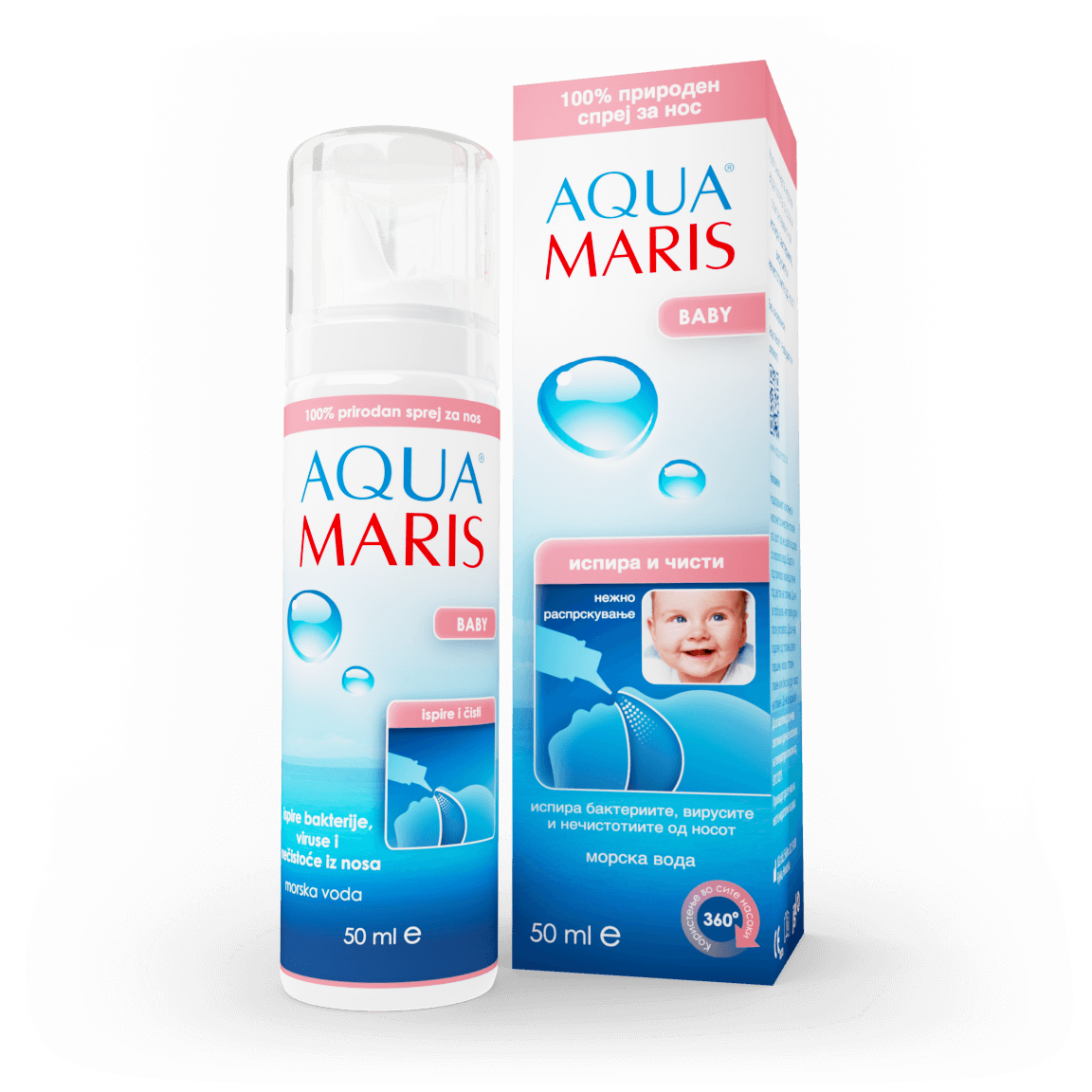Normalno je disanje izrazito važno za zdrav san, hranjenje i razvoj dojenčadi. Začepljenost nosa predstavlja česti problem koji uzrokuje nadraženost i nesanicu u dojenčadi i male djece. Izotonična morska voda prikladna je za korištenje već od rođenja i namijenjena je svakodnevnoj higijeni nosne šupljine prije dojenja ili hranjenja na bočicu te tijekom bolesti povezanih s gornjim dijelom dišnih putova, koje otežavaju disanje kroz nos. Odaberite jedan od naših proizvoda osmišljenih posebno za djecu, Aqua Maris Baby kapi (10 ml) ili Aqua Maris Baby sprej (50 ml) kako bi vaše dijete bolje spavalo, lakše jelo i disalo na prirodan način.
